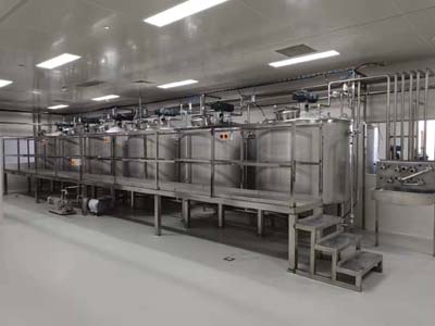 預處理的牛奶冷卻到培養(yǎng)溫度,然后連續(xù)地與所需體積的生產(chǎn)發(fā)酵劑一并泵入發(fā)酵罐,罐滿后,開動攪拌數(shù)分鐘,保證發(fā)酵劑均勻分散。發(fā)酵罐是隔熱的,以保證在整個培養(yǎng)期間的恒溫。為了能對罐內(nèi)酸度發(fā)展進行檢查,可在罐上安裝pH計。典型的攪拌型酸奶生產(chǎn)的培養(yǎng)時間為2.5-3hr,42-43℃,使用的是普通型生產(chǎn)發(fā)酵劑。為了獲得產(chǎn)品,當pH值達到理想的值時,停止細菌發(fā)酵,產(chǎn)品的溫度應在30分鐘內(nèi)從42-43℃冷卻至15-22℃。同時為確保成品具有理想的粘稠度,對凝塊的機械處理必須柔和。冷卻是在具有特殊板片的板式熱交換器中進行,這樣可以保證產(chǎn)品不受強烈的機械擾動。冷卻到15-22℃以后,酸奶就準備包裝。果料和香料可在酸奶從緩沖罐到包裝機的輸送過程中加入。這是通過一臺可變速的計量泵連續(xù)地把這些成分打到酸奶中,經(jīng)過混合裝置混合?;旌涎b置的設計是靜止和衛(wèi)生的,并且保證果料與酸奶徹底混合。果料計量泵和酸奶給料泵是同步運轉(zhuǎn)的。
